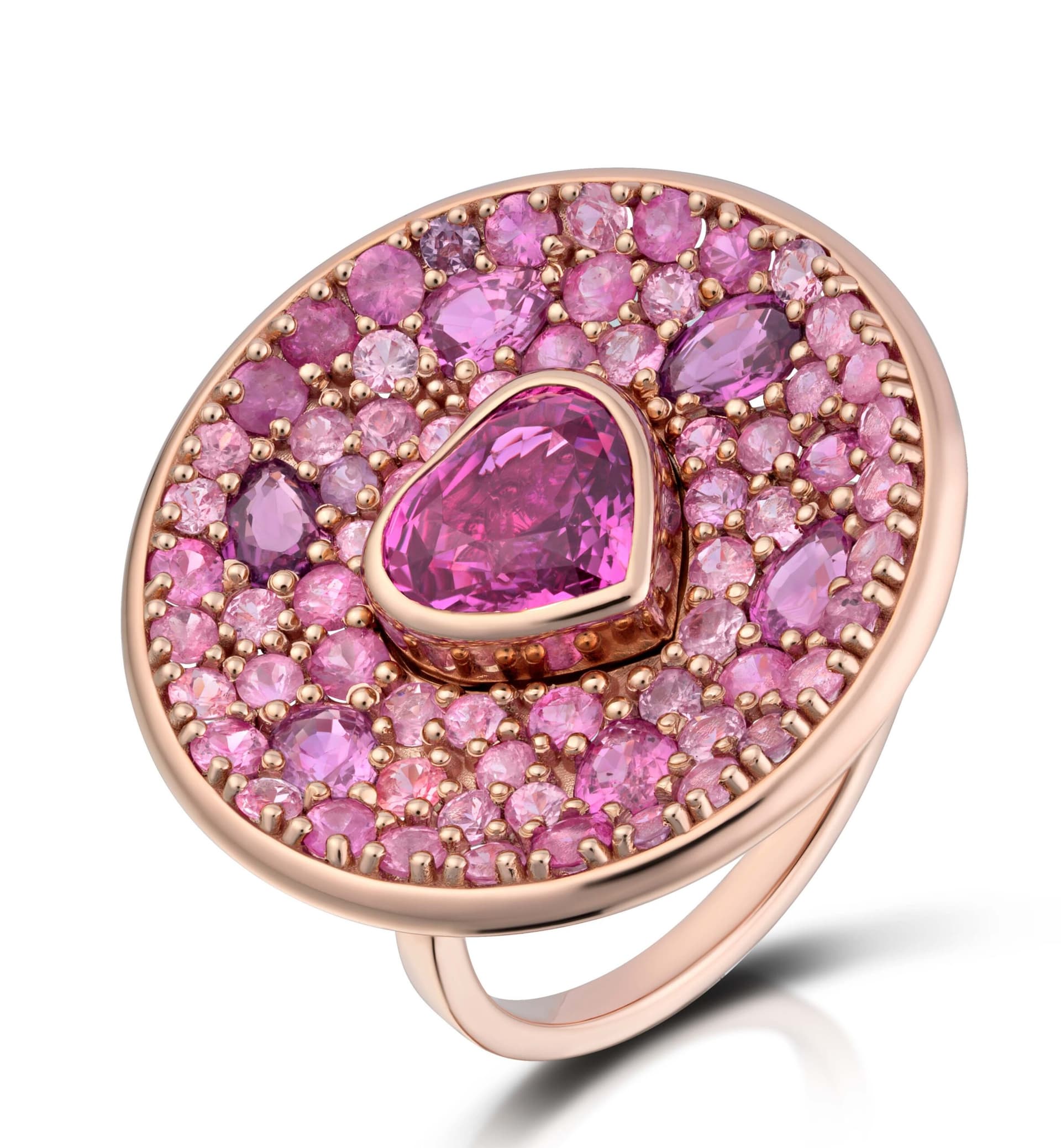 Is this a ring? A pendant? Or both? This alluring and mysterious piece is 14kt rose gold, set with a natural 3.5ct center, unheated heart-shaped pink sapphire. The pear-shaped sapphires that surround it exceed 4 cts and are also unheated and untreated. The small round sapphires are heated pink sapphires. Designed, cast, set completely in Canada.